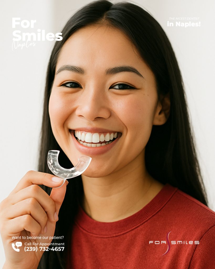 At For Smiles, we offer custom-fitted night guards to help prevent damage from teeth grinding (bruxism) and jaw clenching during sleep. A night guard cushions your teeth, protects your enamel, and can help relieve jaw discomfort or headaches.